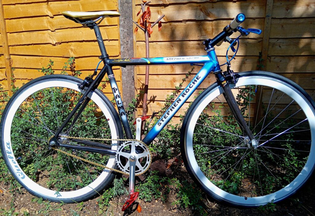 It’s an ultra light aluminum and carbon fibre frameset from Stephen Roche, Quella wheels (our favourites for single speed builds) and various other lightweight components. It’s going to be quick!